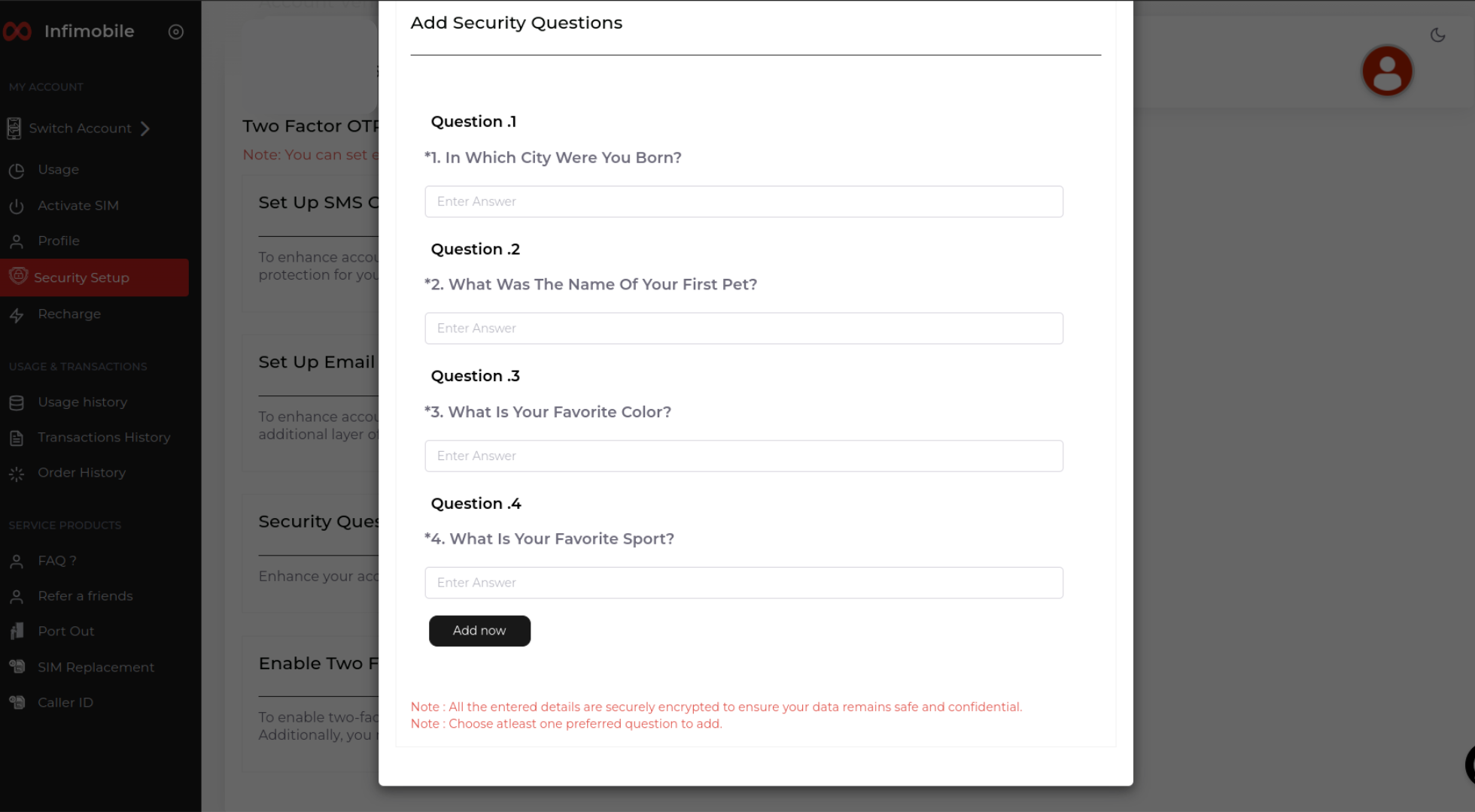 Security Questions: Click "Verify." A form will display three questions—provide answers to the required ones and click "Add Now" to save them.