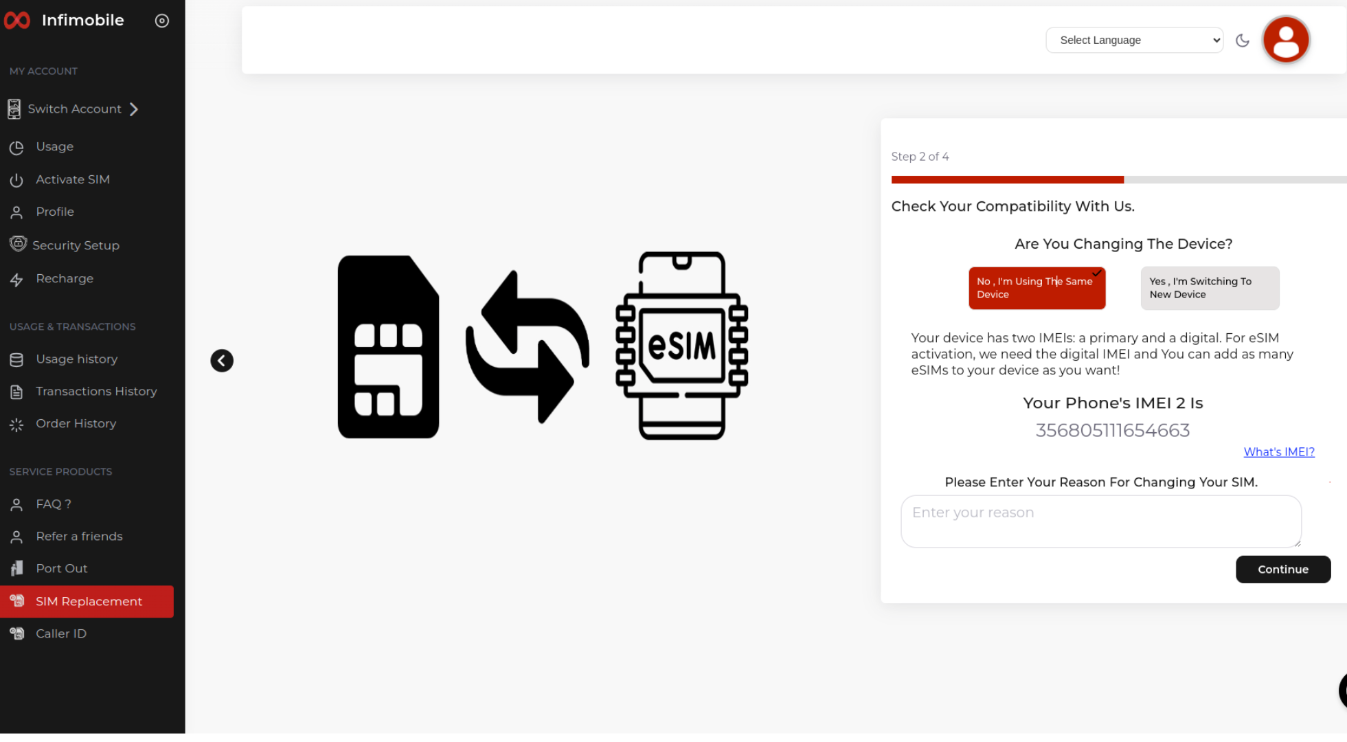 Step 2 : Go to the SIM Replacement section and select pSIM to eSIM.