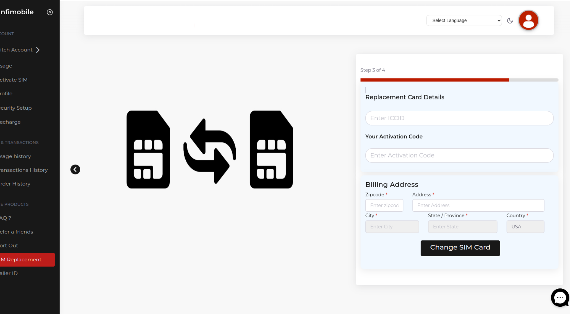 Step 5 : Please provide the sim card details—ICCID and activation code—and complete the billing address section and click on "Change sim card ".