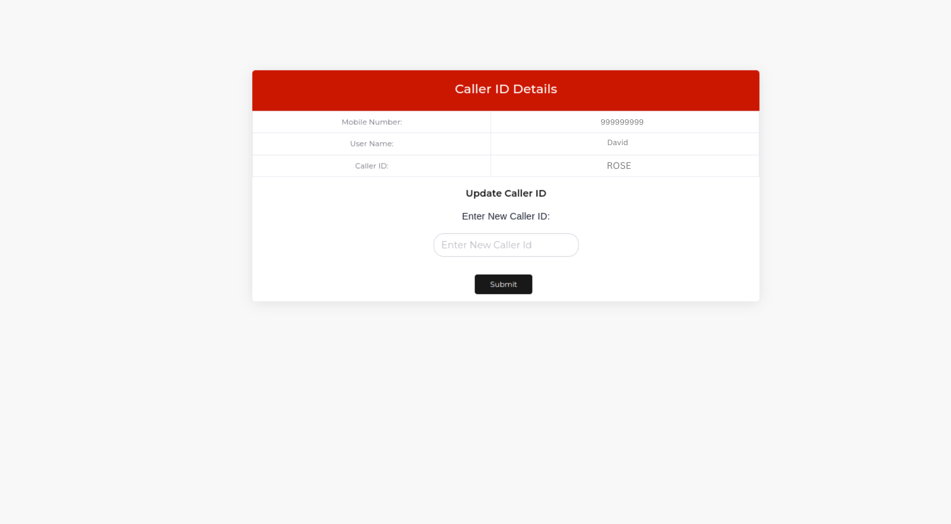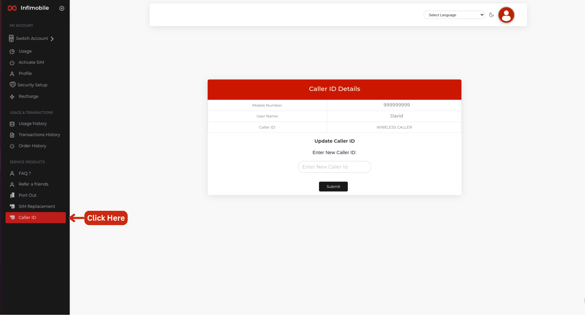 Step 3: You can view your Infimobile number and username. By default, your caller name will appear as "Wireless Caller." To change it, simply enter the name you want to display as your caller ID and click Enter. Your caller ID will be updated instantly.