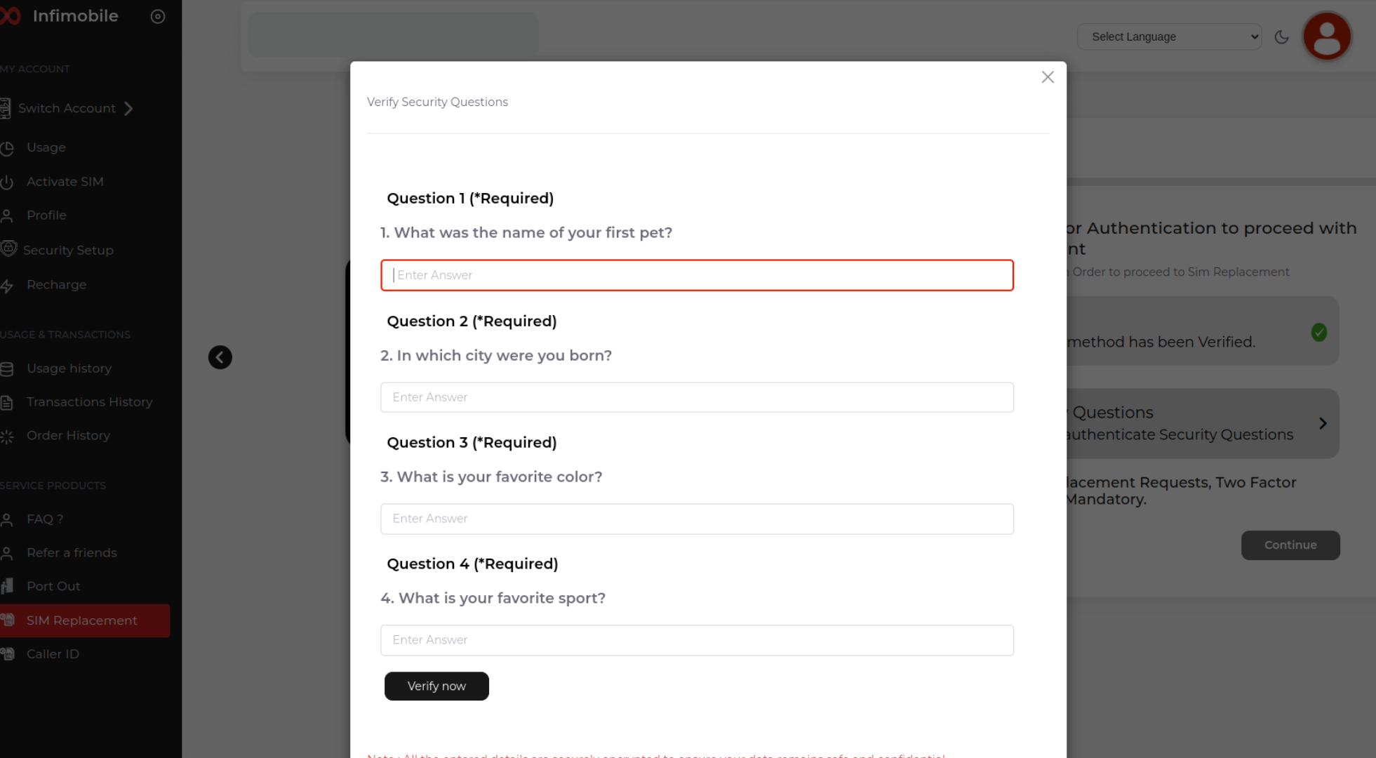Please make sure to enter the exact same answers you provided during the security setup. If the answers don’t match, the SIM swap request cannot be processed.