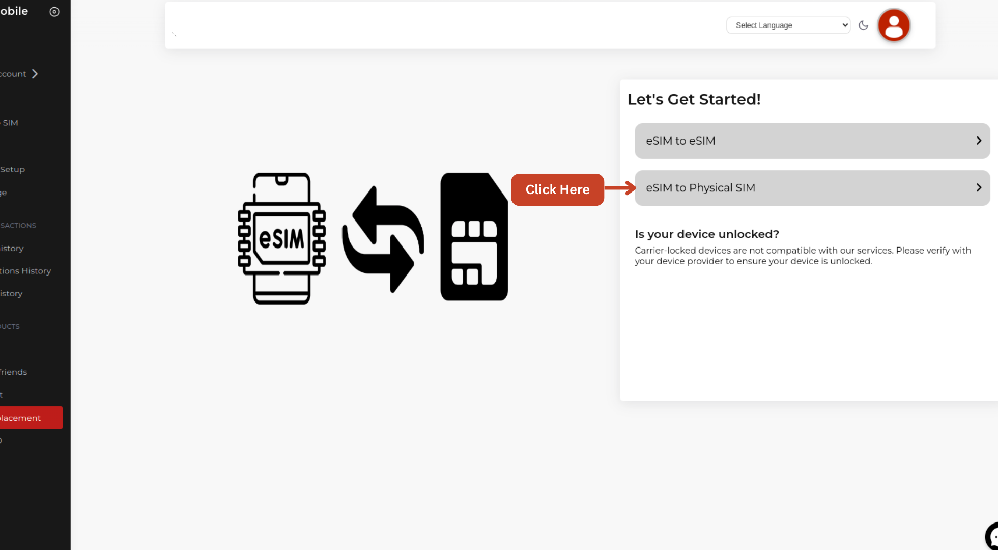 Step 2 : Go to the SIM Replacement section and select eSIM to pSIM.