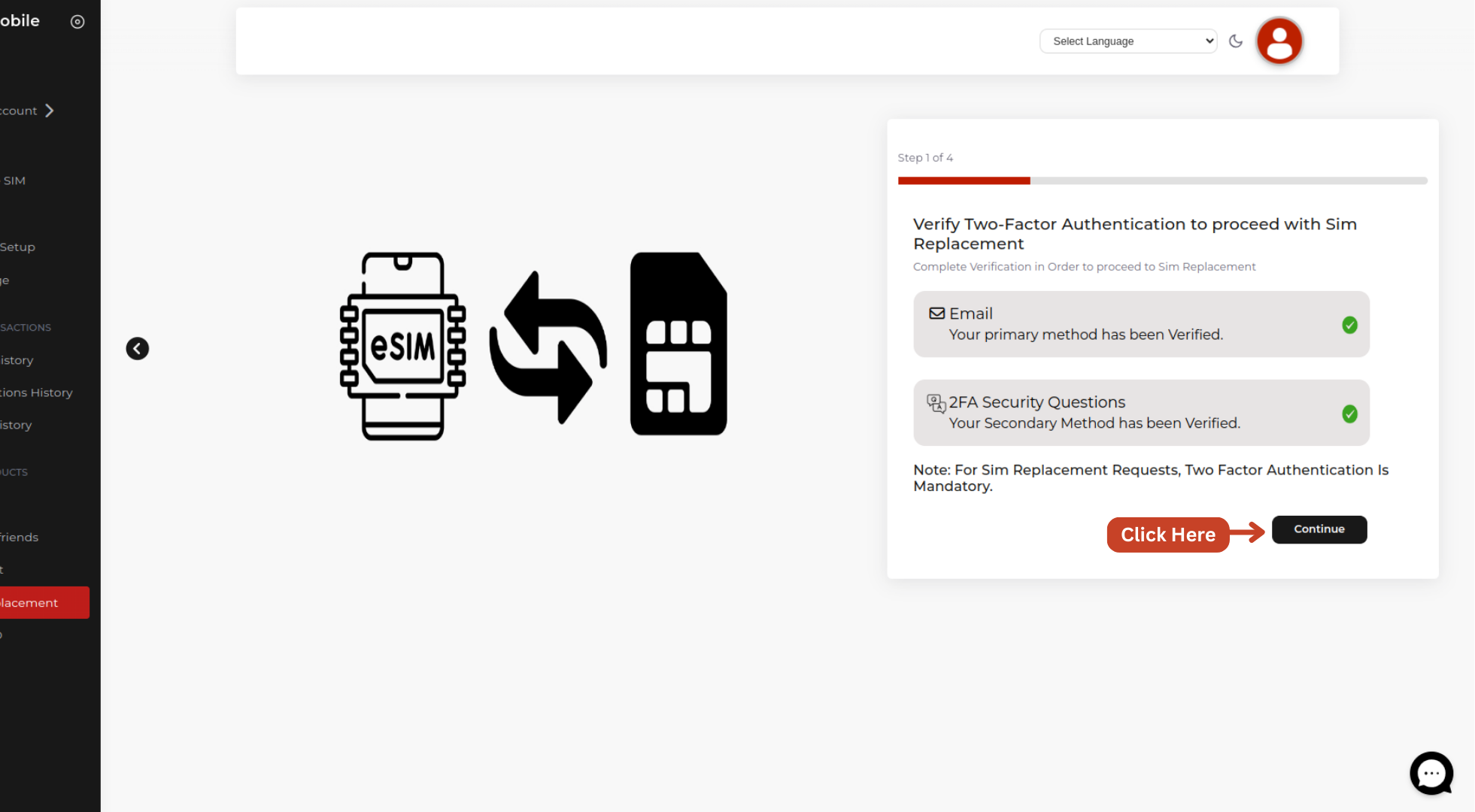 After completing the 2FA verification via email/ SMS, and security questions, simply click on "Continue" to proceed with the SIM swap process.