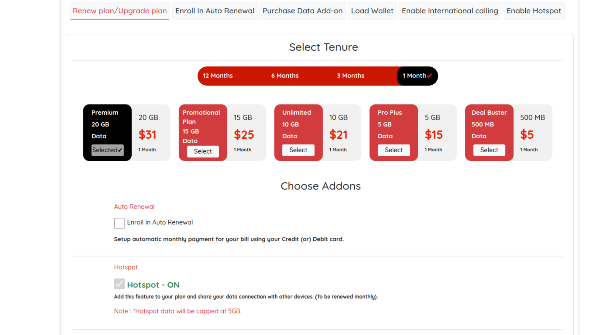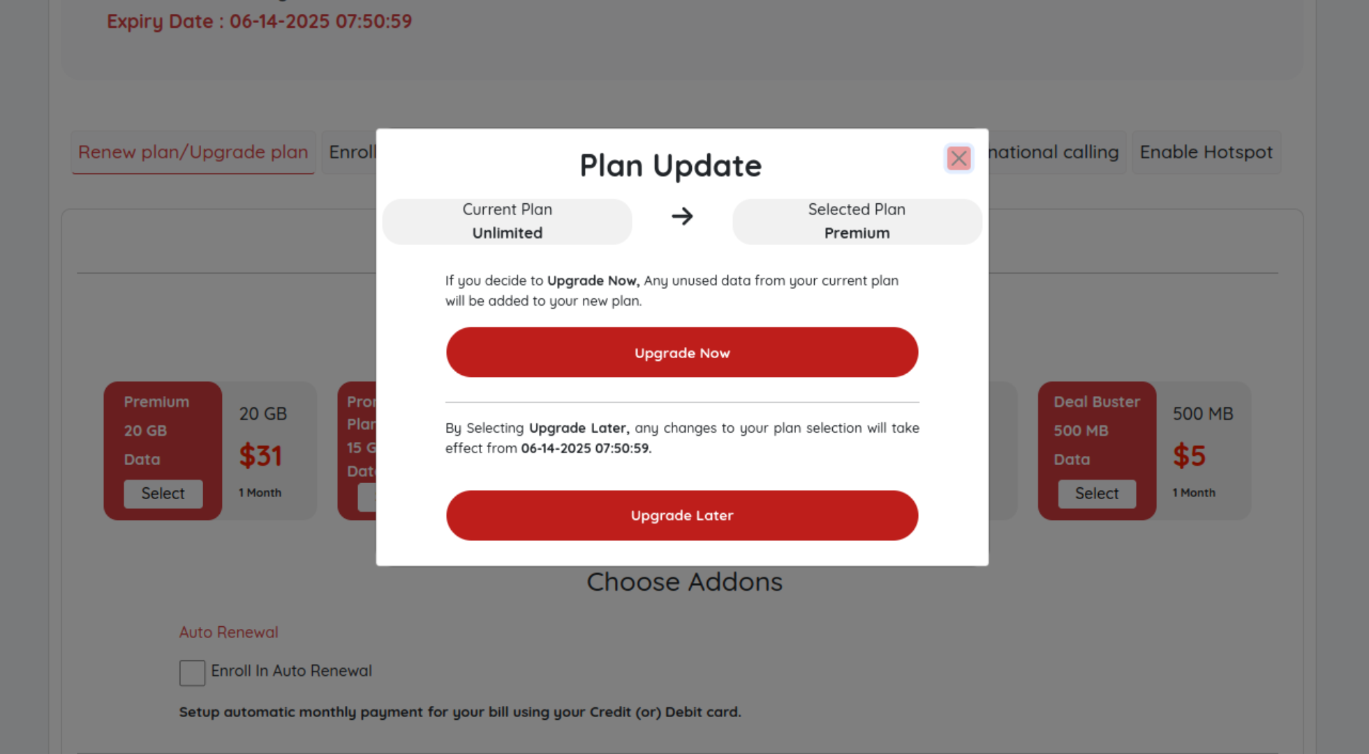 Step 7: Once the payment is completed, the new plan will be added to your queue and will automatically activate after your current plan expires.